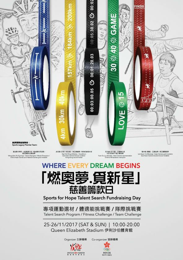 [2017年10月16日,香港]運動燃希望基金將與港協暨奧委會奧夢成真計劃合辦「燃奧夢.覓新星」慈善籌款日,透過專項運動選材計劃協助青少年發掘個人運動潛能,並設有體適能挑戰賽和隊際挑戰賽,讓運動愛好者在考驗個人體適能狀態的同時,為運動燃希望基金籌募更多善款去支援各項活動的經費。是次活動將於2017年11月25及26日(星期六及日)一連兩天假灣仔伊利沙伯體育館舉行。